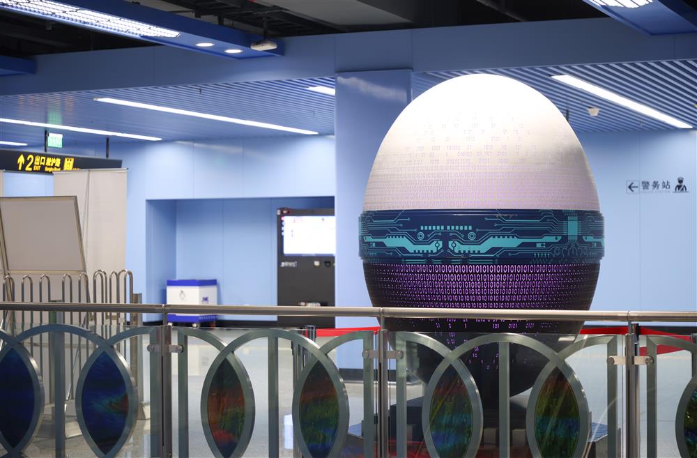 《010》艺术装置原作展陈在国内首条采用全自动无人驾驶技术的大容量轨道交通线路一一上海地铁10号线国帆路站。装置主体为高近2米的椭圆体。椭圆体外形似数字“0”,中间饰有集成电路图案的一圈横带构成数字“1”。艺术家介绍,“0是无,1是有,展示‘有无相生’的古哲思辨。现代文明进入数字和人工智能时代,0和1,更有着非凡的含义。”