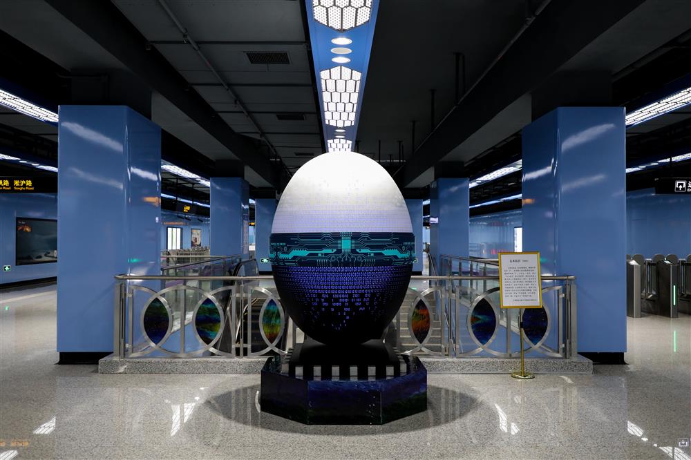 将1和0组合,契合地铁10号线的数字,作品取名“010”,宛如天成。这件装置又名“福蛋”,与紧邻国帆路站的复旦大学江湾校区相呼应。装置巧用LED光源,形成“灯光起处,日月光华;惊鸿一瞥,旦复旦兮”的美妙气象。