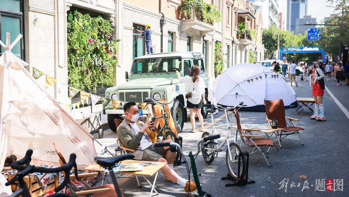 2022年9月24日,上观新闻记者在茂名北路上看到, 这条限时步行街的东西两侧分别是海派特色空间丰盛里和昔日的“海上第一名园”张园,石库门、复古车、露营帐篷组成的潮流市集,吸引市民驻足参观和体验。