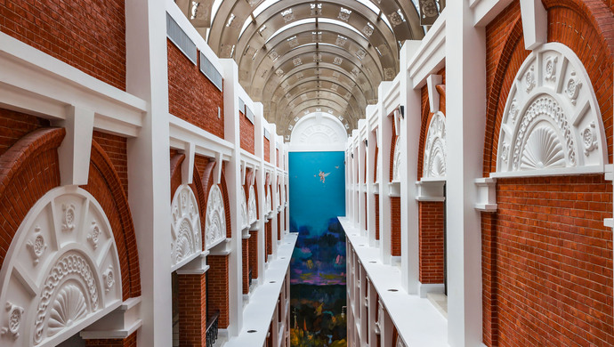 中庭透光屋顶,重新绘制了极具纵视感与穿越感的中庭壁画,具有中国韵味与欧洲味道兼容并蓄的特色,恰如这栋集合了巴洛克、维多利亚等元素的折中主义建筑,中西合璧,于富丽中显高雅。