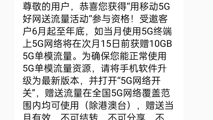 ▲何先生六月收到短信通知,7月下旬获赠10G的5G单模流量。