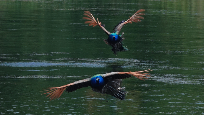 “大家注意看,马上就将有110只孔雀凌空飞来!”伴随着夏玲蓉的介绍,围观游客中爆发出一阵“哇”的声音。大家早已举起手机、相机,“长枪短炮”地对着夏玲蓉与百米开外湖对岸的林间高阁。14时一到,夏玲蓉吹响口哨,将一把黄灿灿的玉米撒向空中。伴着袅袅丝竹声,百只孔雀展开双翅、拖着翠尾从高阁掠影而下,或径直飞到草地上觅食,或惊鸿点水,在湖面上激起阵阵涟漪。还有几只孔雀叛逆飞回林中,“这都是不成器的”,夏玲蓉的解围引得游客纷纷发笑。“我第一次看到这么多孔雀!”“孔雀竟然会飞,太壮观了!”赏罢放飞奇观,游客们拍手叫绝。